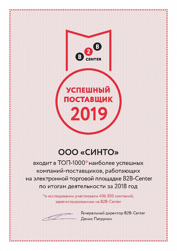 Компания СИНТО вошла в ТОП-1000 успешных поставщиков по версии рейтинга электронной торговой площадки B2B-Center